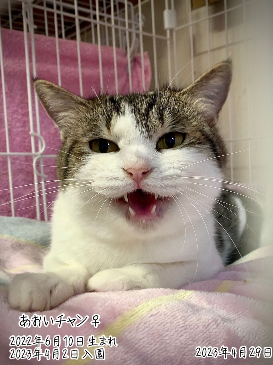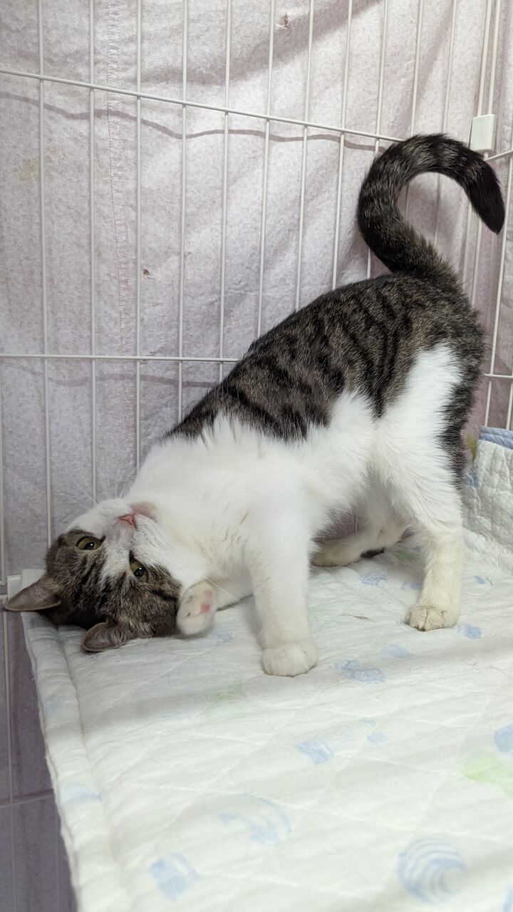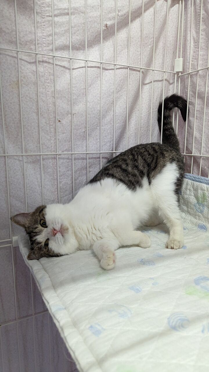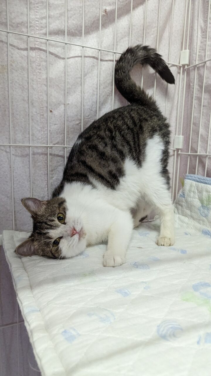 近況:毎日元気に走り回ったりネズミのおもちゃを追っかけたり遊ぶのが大好きです。最近はよく鳴くようになりました。ご飯やオヤツが欲しいと「キャッキャッ」と声を出します。